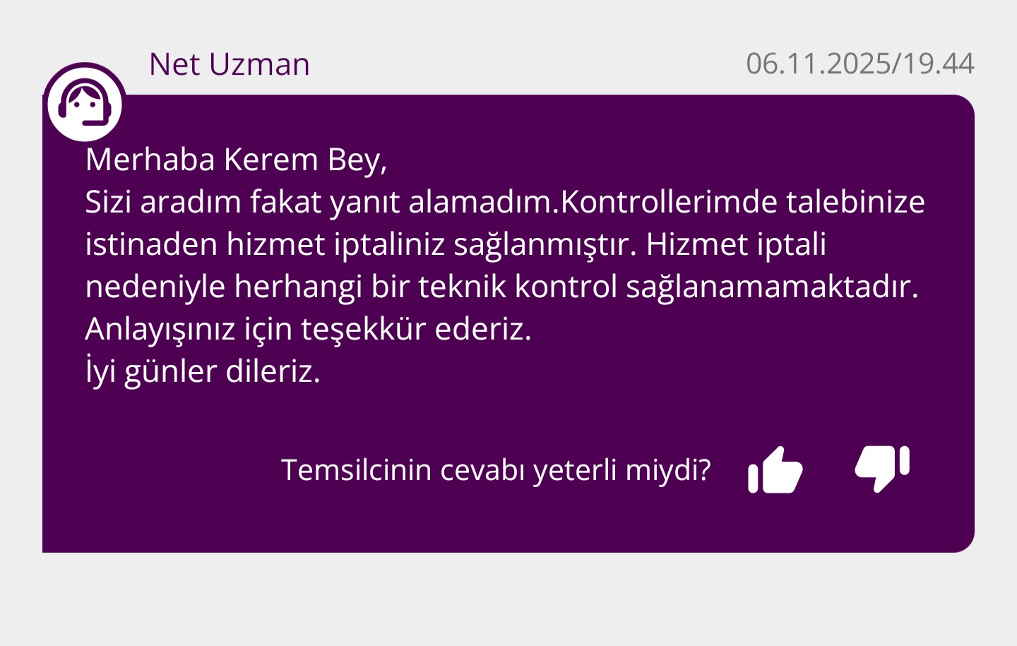 | Merhabalar, turknet hakkında böyle düşüneceğim aklıma gelmezdi fakat size yaşadığımı anlatıyorum. 2 senedir aktif turknet kullanıyordum adresime turk telekom fiber 1000 mbps gelince 5 kasımda turknet aboneliği mi iptal edip turk telekoma başvurdum. Turknet'in kendi söylediğine göre iptal ettikten 5 gün sonra internet hizmetim durdurulacaktı fakat her ne hikmetse 2 senedir hiç gün içinde planlı çalışma yapmayan turknet birden ben aboneliğimi iptal edince çalışma yapacağı tutuyor ve destek kaydı oluşturduğumda iptal ettiğiniz için teknik kontrol sağlanamamaktadır yanıtını alıyorum. Görseller aşağıda mevcuttur. Bir daha turknet kullanırmıyım sanmam. (2 gündür internet yok hala) < Resime gitmek için tıklayın > < Resime gitmek için tıklayın > < Resime gitmek için tıklayın > |