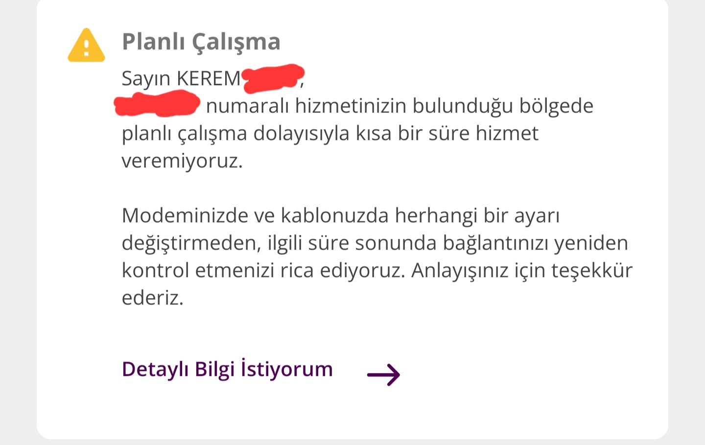 | Ben hizmetimi iptal etmedim ama yaklaşık 15-20 gündür planlı çalışma yazısı bende de var. İnternetimde bir sorun yok ama gayet stabil kullanabiliyorum. Bence size özel bir durum değil |