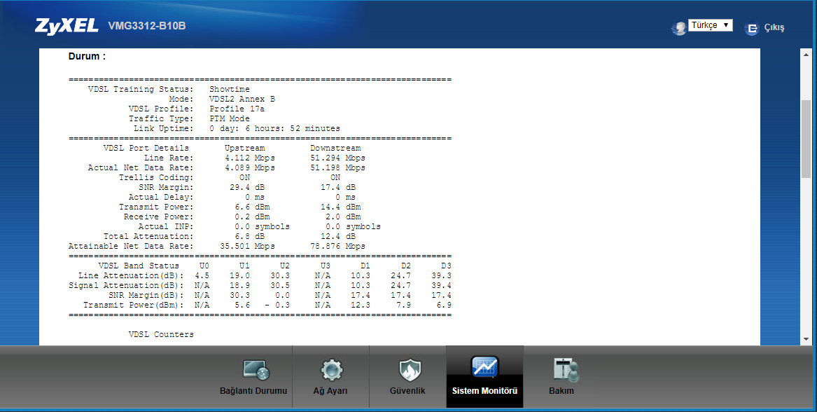 | Değerler güzel, kopma derken dsl ışığı mı gidiyor, yoksa ışıklar sağlamken sayfalar mı açılmıyor? Ben 8 db snr ile hiç kopma yaşamıyorum. |