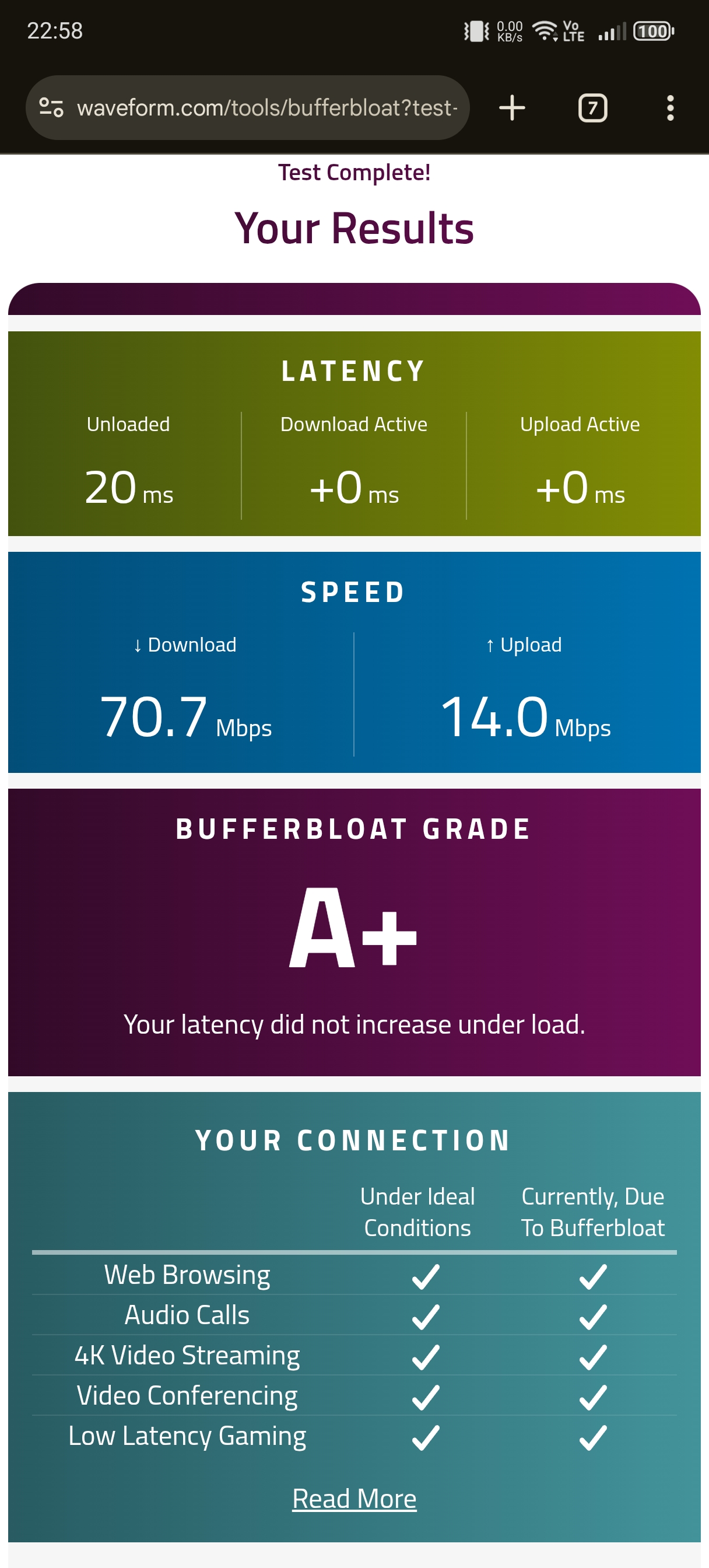 Arkadaşlar, buradaki yorumları okuyunca biraz tereddüte düştüm. Şu an turknet vdsl kullanıyorum, saha dolabına kadar fiber, dolap apartman önünde, yani benim modeme yaklaşık 30 mt falan. Şimdi Türk Telekom bina içine fiber hat çekti, Turknet üzerinden fibere geçebiliyorum, ama geçmeli miyim? Benim açımdan 100mbit yeterli, ama asıl önemli olan şey ping değerlerim, bufferbloat, vs. Yani kayıpsız hatasız internet olması. Fibere geçsem daha mı iyi olur acaba? Fikirlerinize ihtiyacım var. Normalde bufferbloat testim bu şekilde : < Resime gitmek için tıklayın > |