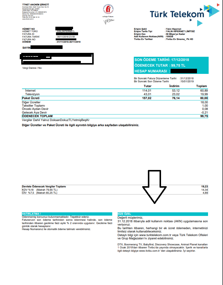 Arkadaşlar merhabalar,resimde gördüğünüz fatura TurkTelekom Kasım Ayı faturası.