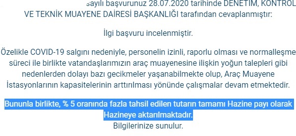 | Devlet açıklama yaptı pandemiden dolayı muayeneler ertelendi ve gecikme ücreti tahsil edilmeyecek diye . Ama doğuş grup dediki devletin yaptığı açıklama beni ilgilendirmez ben gecikmeyi tahsil ederim . Yani şuan devlet alınmayacak dedi ama gecikme ücreti alınıyor. |