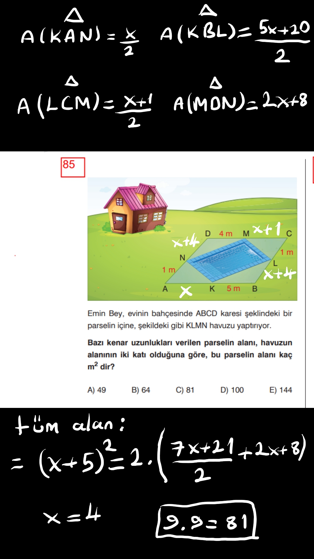 üçgenlerin alanlarını toplayıp ikiyle çarpınca karenin alanını verir