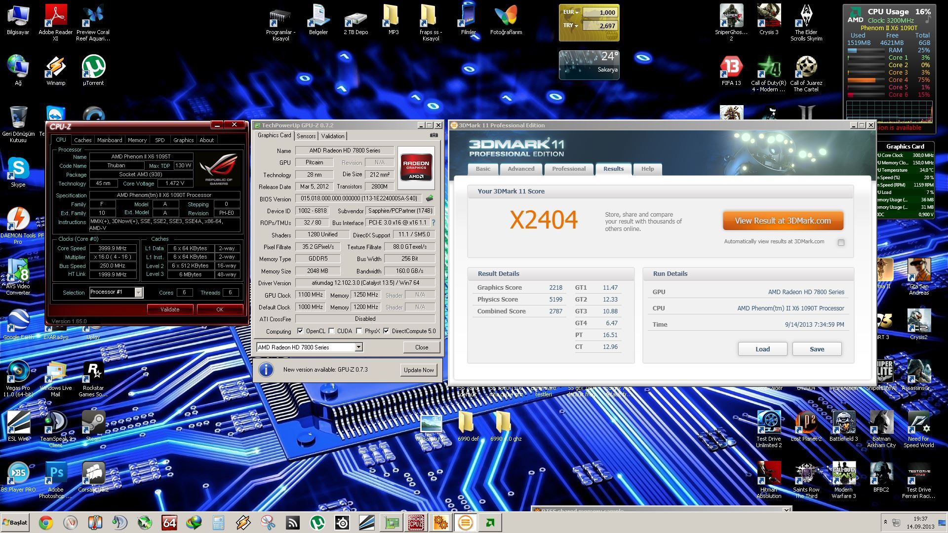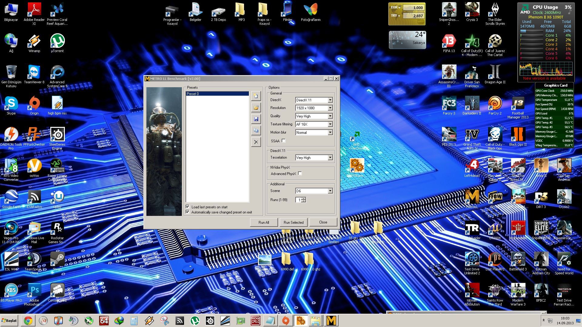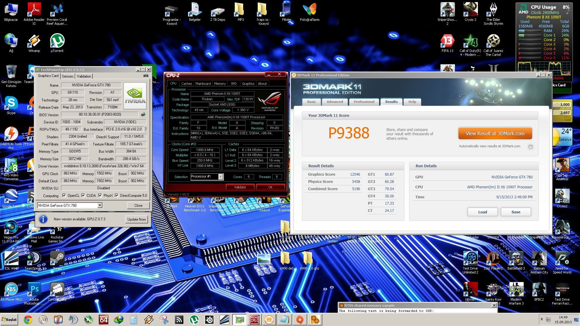 ***Ekran görüntülerini ilk olarak tüm sistem Default hızda HD 7870 Default hızda HD 6990 2. Bios 880 Mhz de GTX 780 Default hızda Ve sonra sistem 4000 Mhz de hızaşırtılmış şekilde HD 7870 1100 Mhz Gpu 1250 Mhz bellek,GTX 780 arkadaşın evinde misafir olduğum için stok hızda ve oc li hızda ayrı ayrı test edecek sürem olmaması sebebiyle sadece sistem 4000 Mhz de Stok hızda kullanılmıştır.