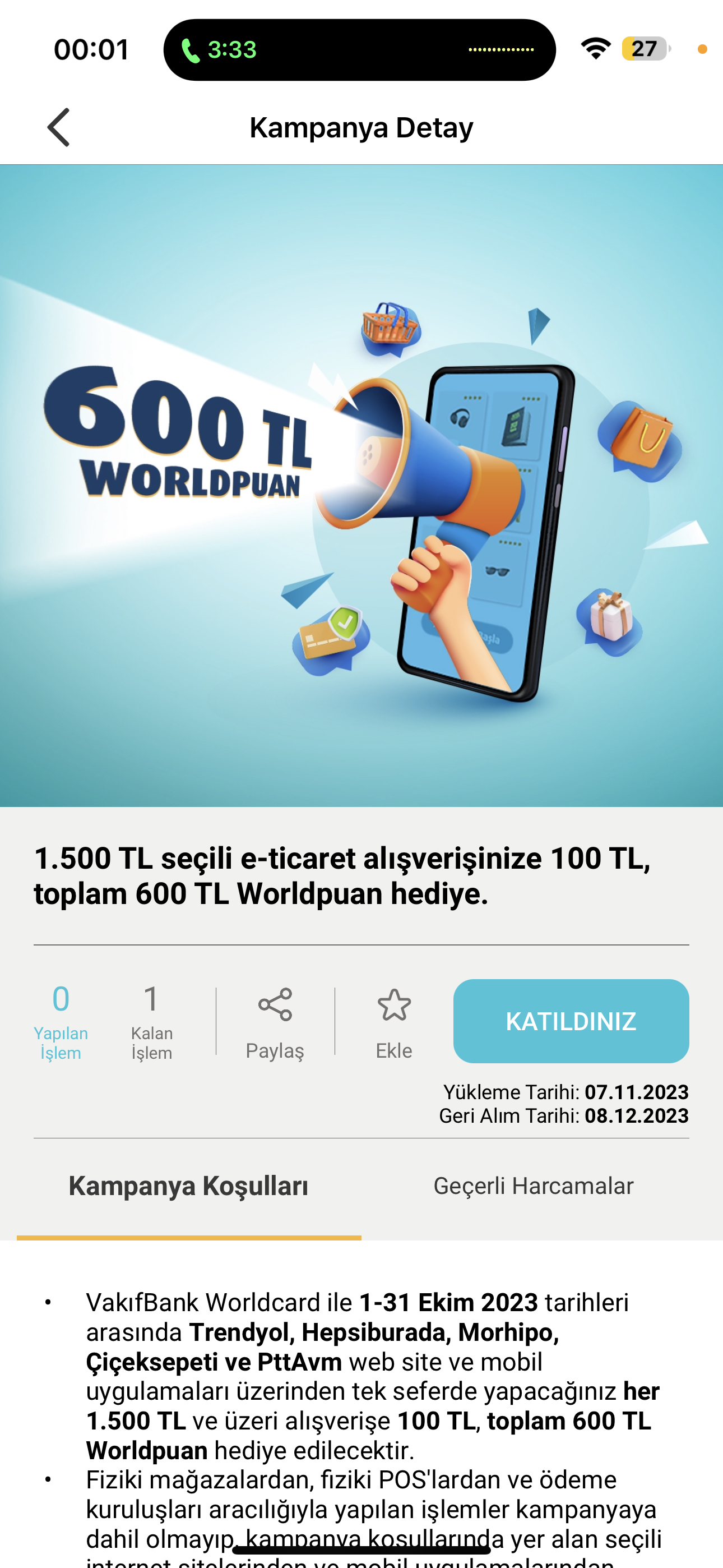 Vakıfbank’ın temmuz ayı kampanyaları felaket olmuş. Böyle kampanyalar yapacaklarını kat sayıyı düşürsünler daha iyi. Bu şekilde nasıl puan toplayalım? Akaryakıt 750x4’e 50 worldpuan… Market 500/15 worldpuan. O da ilk alışverişten sonra. E-ticaret 1000/40 worldpuan. O da ilk alışverişten sonra. Mobil ödeme de 200/10 ama toplamda artık 100 değil 70 worldpuan veriyor. |