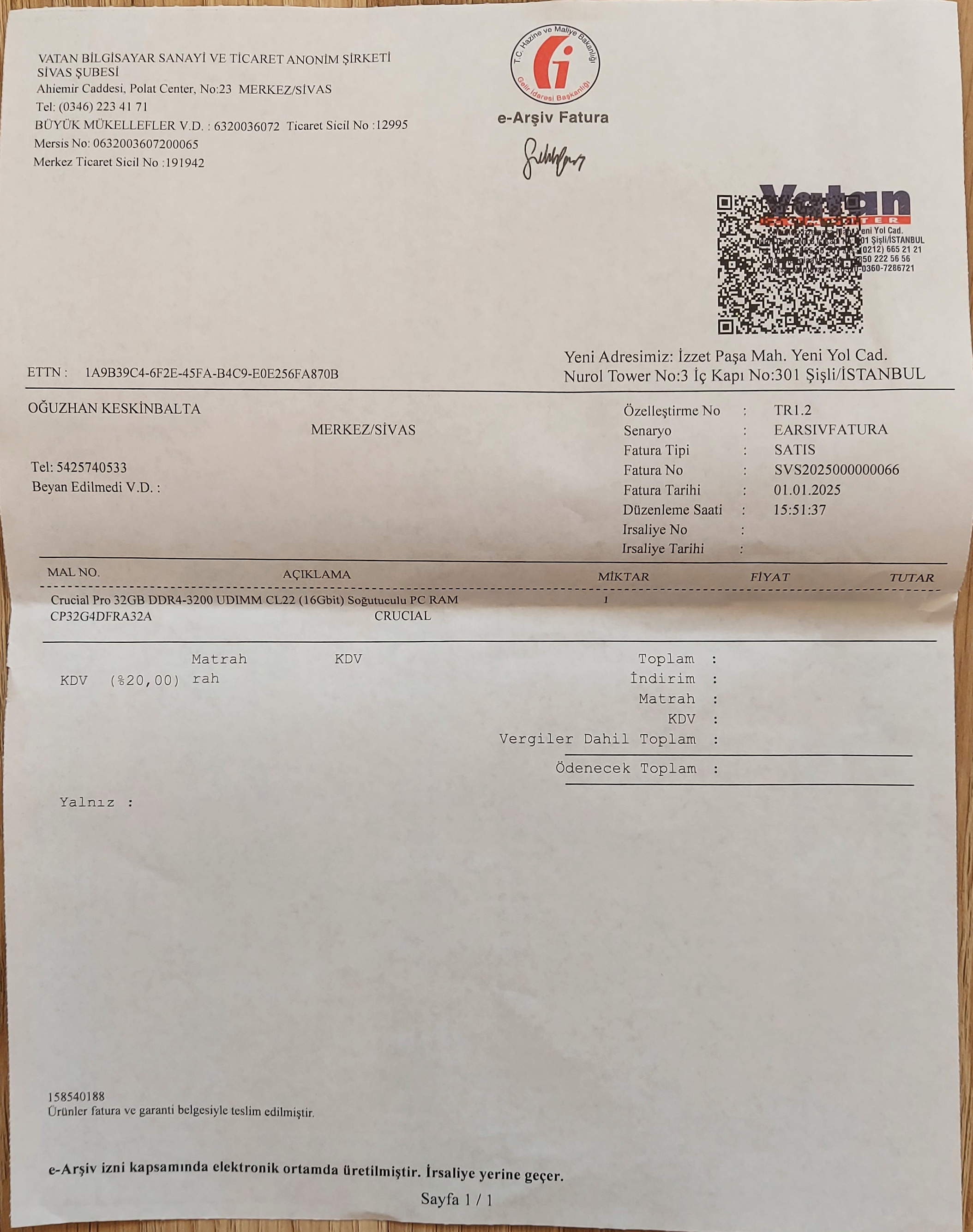 Fatura ve Garanti: Ürünün 01.01.2025 tarihli Vatan Bilgisayar e-faturası mevcuttur (Görsellere eklenmiştir; kişisel bilgiler ve fiyat, gizlilik ve ticari mahremiyet nedeniyle karartılmıştır). Crucial (Micron) tarafından sağlanan sınırlı ömür boyu garantisi  devam etmektedir. Fatura, bu garantinin kanıtıdır.