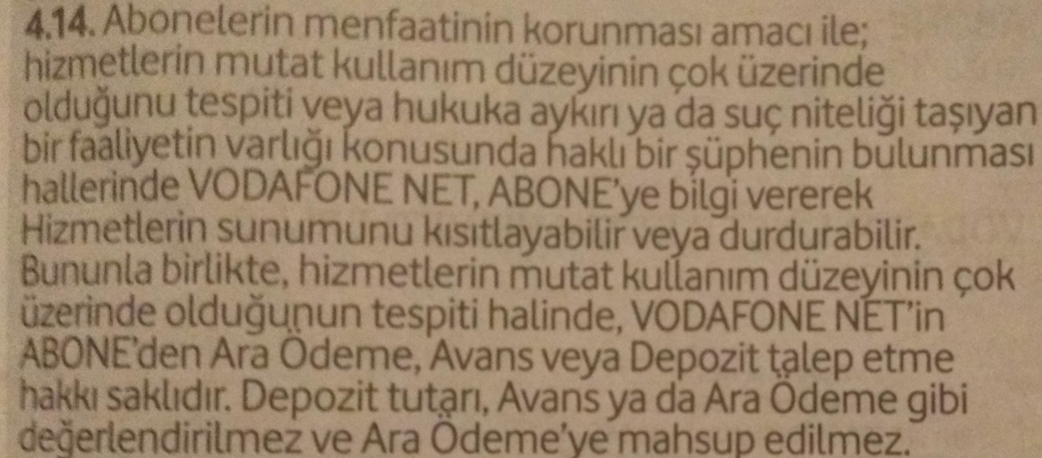 Güncel VodafoneNet sözleşmesindeki bu gibi maddelerle satış sırasında kelime oyunlarıyla taahhüt ettikleri üzerine tüketicinin hak iddia etmesi pek mümkün değil. Kolayca görünüyor ki, devlet altyapı yatırımı yapmamak için çağ ve akıl dışı AKN'ye yıllarca göz yumduktan sonra "biz teknoloji, bilgi vesaireciyiz" kisvesi altında AKN'yi kaldırıyor görünüp, servis sağlayıcıların, (ki vodafone'un da tecrübe ettiğim gibi devletin fiilen el koyduğu Turkcell'e'a çalıştığı düşünülürse 3 sağlayıcı da devlete ait) fiyatları katlayıp başka bir kisve altında çirkince sınırlıyor. Hem de bu sefer daha önce çizgileri belirli olan koşullar yerine istediği şekilde yorabileceği muğlak ifadelerle aboneliği sona erdirme veya ekstra fatura kesme hakkı bularak... Maalesef geri kalmışlığın en kolay ölçütlerinden biri... < Resime gitmek için tıklayın > < Resime gitmek için tıklayın >