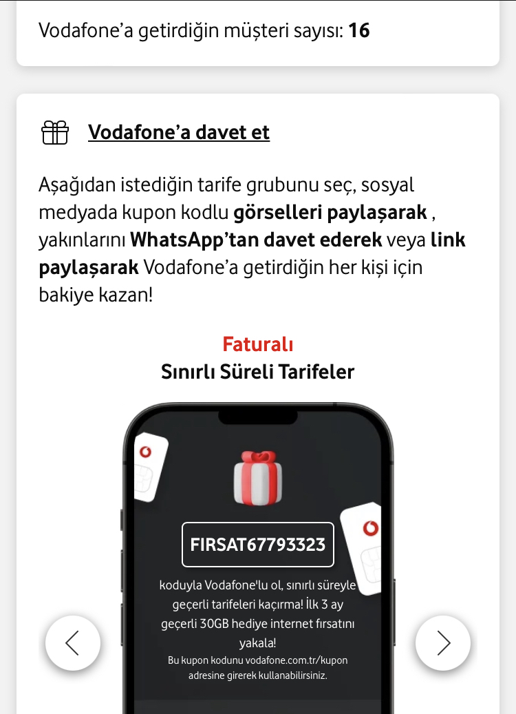 Vodafone'a geçenler için referans kodum: FIRSAT66124959 Ayrıca 3 GB hediye internet için Vodafone Yanımda uygulamasını ilk kez bu linkten kullanabilirsiniz: https:// vfselfservis.page.link/kd9fR5Tn33PEJBnc7 |