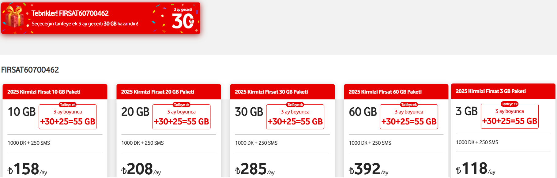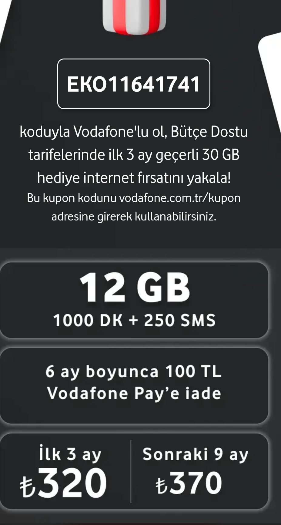 Uygun fiyatlı, kuponlu ve faturalı Vodafone Yalın Fırsat tarifeleri 22 Aralık 2024 tarihi itibarıyla müşteri alımına kapatılmıştır. Fakat kuponlu ve faturalı bazı diğer Vodafone cep telefonu tarifeleri hala müşteri alımına açıktır. Söz konusu tarifelere geçiş yaparak ilk 3 ay boyunca +30 GB hediye (ve bazı ek şartları yerine getirerek diğer bazı hediyeler) kazanabilirsiniz. Bu konudaki en kapsamlı hediye listesini ve ilgili talimatları görmek için bu linke tıklayın. < Resime gitmek için tıklayın > |
