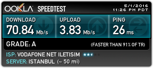 Arkadaşlar geçen hafta cuma başvuru yapmıştım.Dün 27.04.2016 da internetimi kullanmaya basladım.Size sunları söyleyebilirim.64 mbps 240 akk li pakete geçtim, verdikleri hız söylediklerinin üstünde şimdilik kullandıgımdan beri bir sorun görmedim.Yalnız özellikle suna dikkat edin, müşteri hizmetleri çok kötü.Ne dediğinizi anlıyor ne de doğru dürüst bir çözüm üretebiliyor.Benim sorunum şuydu modem kurulumunu yaptıgım halde internete baglanamıyordum.Defalarca aradım düzgün bir çözüm üretilemedi,meğer sorunu kendim buldum.Kendi verdikleri modem kullanmadıgım için vlan id 35 olarak ayarlanacakmıs.Kendim deneyerek buldum yani anlayacağınız.Özet olarak müşteri hizmetleri dışında şimdilik bir sorun yok.Ankara-Keçiören kullandıgım yer. Bu da merak edenler için speedtest sonucu: http://www.speedtest.net/my-result/5285077033 |