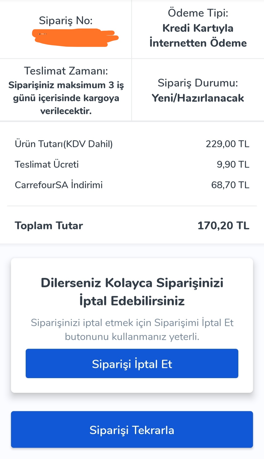 ürünü 2 gün önce sipariş verdiğimde herhangi bir stok sorunu yoktu. sipariş detay bilgilerine tıkladığımda sipariş numarası var ama bölgenizde stok yoktur gibi bir uyarı var. ürünün kargolanmama gibi bir durumu olabilir mi? ayrıca sipariş detay arayüzü çok kötü carrefour'un hiç beğenmedim