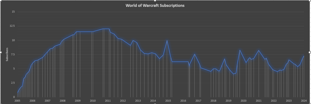 İlgili grafikte de görüleceği üzere zamanında 11 milyonu subscription'ı aşan World of Warcraft, Warlords of Draenor'dan sonra 5 milyonlara kadar düşmüş, 30 Ağustos 2016'da Legion'ı merak edenler geri dönünce hareketlenmiş ama daha sonra tarihinin en düşük subscription oranına gerilemiştir. İşte bu yüzden "Legion nedir ya" :) < Resime gitmek için tıklayın > |