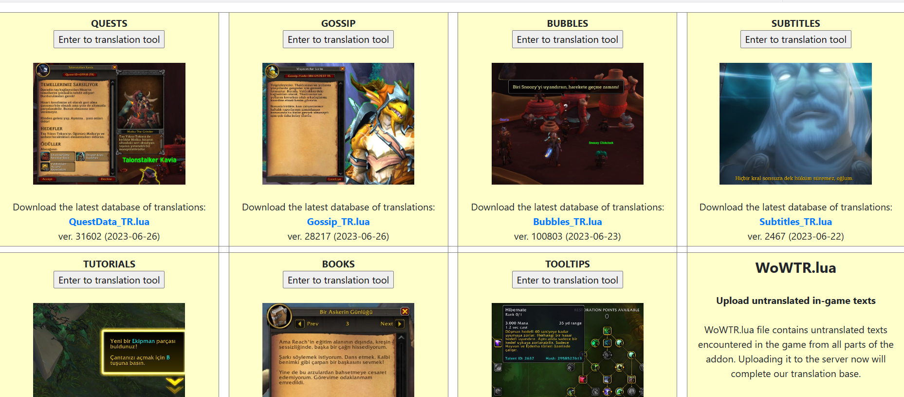 Addonu kullanan arkadaşlar lütfen DC Adresimize gelin bizimle verilerinizi paylaşın : https://discord.com/invite/6gwkDJnkaV 12.06.23 09:29 Çeviri ilerleme durumu: Çeviriler tesbit edilebilen "en" alt yapı üzerinden yapılmaktadır. (Veri tabanımız sürekli güncellenmektedir) Görevler: - base EN: 31561 - base TR: 31561 NPC Dialog: - base EN: 27334 - base TR: 27334 Baloncuk konuşmalar: - base EN: 100452 - base TR: 100452 Sinematikler: - base EN: 2415 - base TR: 2415 |
