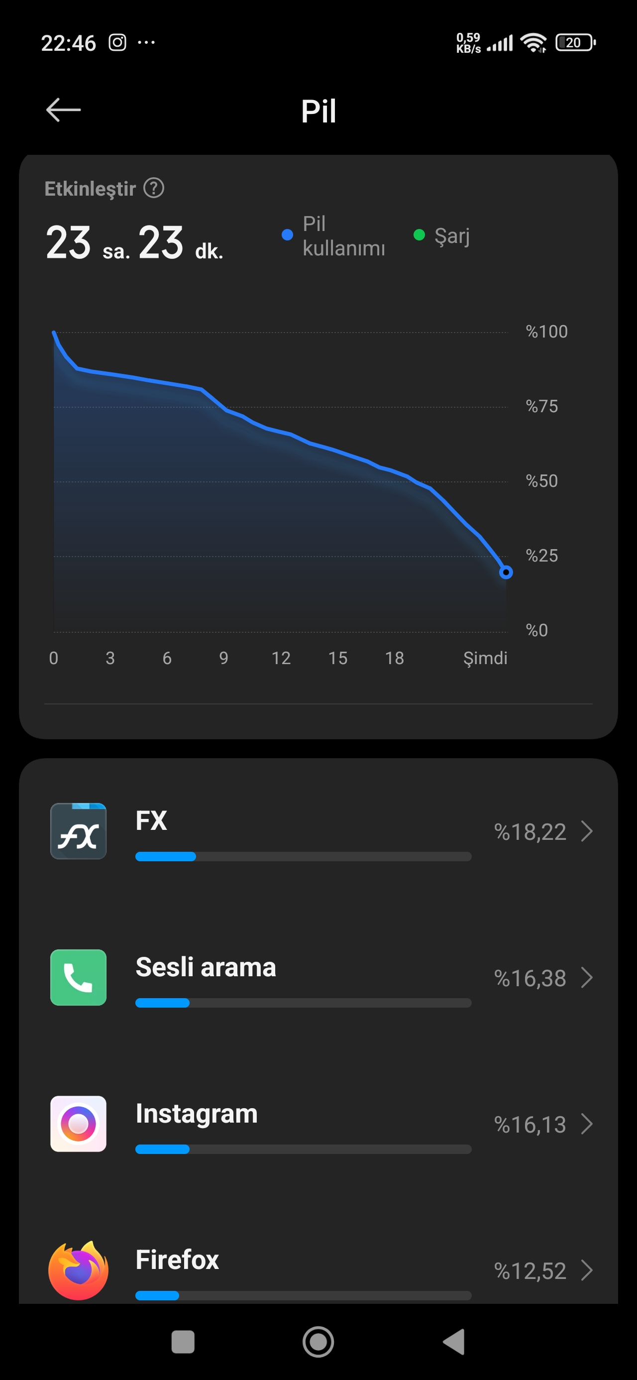 Üstteki hocam Anlık güncelleyeyim Kalan şarj %12 %90 şarj olduktan sonra geçen süre şu anda 24 saat 26 dakika Ekran sürem ise 5 saat 42 dakika 1 saat 17 dakika Firefox 1 saat 3 dakika sahibinden 56 dakika Instagram 42 dakika WhatsApp 41 dakika telefon görüşmesi 23 dakika YouTube |