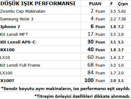 Evet, aşağı yukarı benzer performans veriyorlar. düşük ışıkta X70 az daha önde. yeterli ışıkta X70 bariz önde olur tabii. "Equivalent aperture" diye birşey var, eşdeğer F değeri. Full frame hesabı yapılıyor https://www.dpreview.com/articles/2666934640/what-is-equivalence-and-why-should-i-care/3 şurada da sayfa altında bir önek grafik var. çeşitli makinalar karşılatırılıyor. Neden LX10 istiyorum cevabı orada. https://www.dpreview.com/reviews/panasonic-lumix-dmc-lx10-lx15 ---------------------------------------------------------------- DÜŞÜK IŞIK PERFORMANSI LİSTESİ KÖTÜDEN İYİYE < Resime gitmek için tıklayın > https://www.scantips.com/lights/exposurecalc.html kullanıldı. < Resime gitmek için tıklayın > * Not1: Sensör büyüdükçe (Çarpan küçüldükçe) alan derinliği azalmaktadır, 6D + 24mm1.4 ile hem gözler hem burun aynı anda net çıkmaz. Ama iphone ile 1.8 de bile hem gözler hem burun hem de arkadaki bir çok nesne net çıkar. *Not 2: Liste sadece sensör boyutu ve F değerlerine göre hazırlandı. İso performanları da gerçek kullanımda bu listede biraz oynamalar yapar. Misal Canon 1300D, Samsung NX300 aynı bu listede fakat iso performansı samsungun daha iyi. *Not 3: Ayrıca titreşim önleyici de ciddi katkı sağlar. Olypusun sensörü küçük ama titreşim önleyicisi var. Duran nesnelerde elde çekimi çok etkiler bu. (Fikir vermesi açısından yazdım bunları, hesapta ufak tefek hatala olabilir. Ayrıca odak noktaları da aynı değil makinaların. Biraz elma armut karşılaştırma oldu. Ama fikir verir.) |