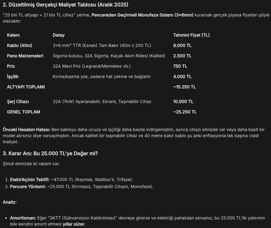 Son Söz: Eğer limit 3.000 kWh'lere çekilirse (ki bu konuşuluyor), evde şarjın maliyet avantajı biter. Ama bataryanın ömrü için "maliyet kafa kafaya bile gelse" evde şarj (imkan varsa) her zaman teknik olarak daha doğrudur. ----- Az önce mahalleye bir çalışma için gelen elektrikçiyle binayı inceledik, kırma, kazma dahil 40m kablolu sistem için 25binTL istedi, 21bin de cihaz. Çok yüksek seviyelere çıkıldığı için dışarıdan devam kararı aldım. Durumu Gemini ile paylaşınca, korkunç dedi, ikinci önerimi dene dedi ama işlerin YZ'nin gördüğü gibi olup olmayacağından şüpheliyim. ----- < Resime gitmek için tıklayın > ----- |