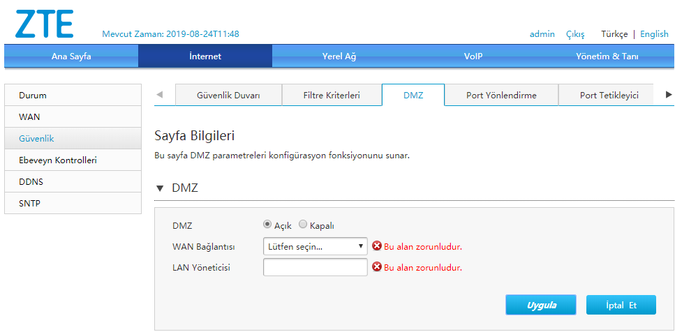 DMZ açmak için resimdeki alanlarda neyi seçmem gerekli? < Resime gitmek için tıklayın > |